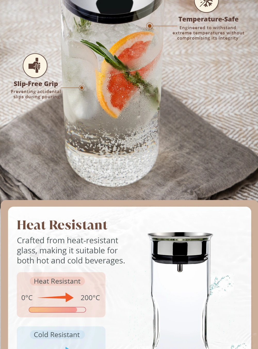 • Ergonomic. Slip-Free Grip: The carafe’s sides are thoughtfully designed to fit comfortably in your hand. preventing accidental slips during pouring.