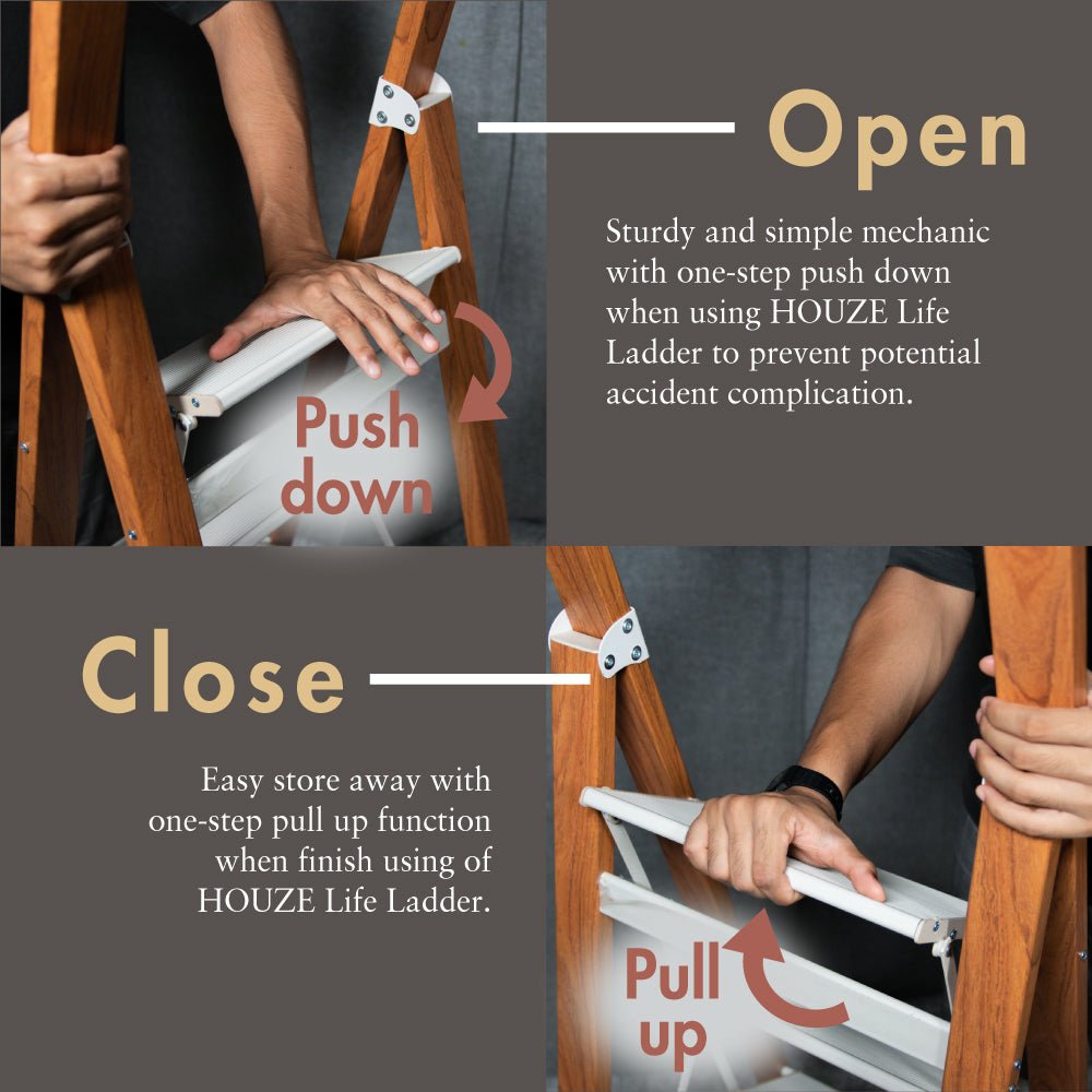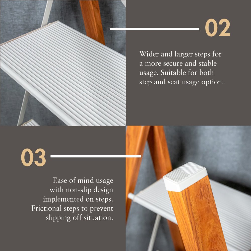 The HOUZE – LIFE Woodgrain 4/5 Tier Ladder isn’t just about reaching those high shelves and elevating every moment. Whether changing a lightbulb. retrieving your favourite book. or draping fairy lights for a festive mood. this ladder is your partner. Its spacious steps ensure comfort. while the solid anti-slip bases guarantee safety. Crafted from enduring aluminium. investing in this ladder promises longevity.