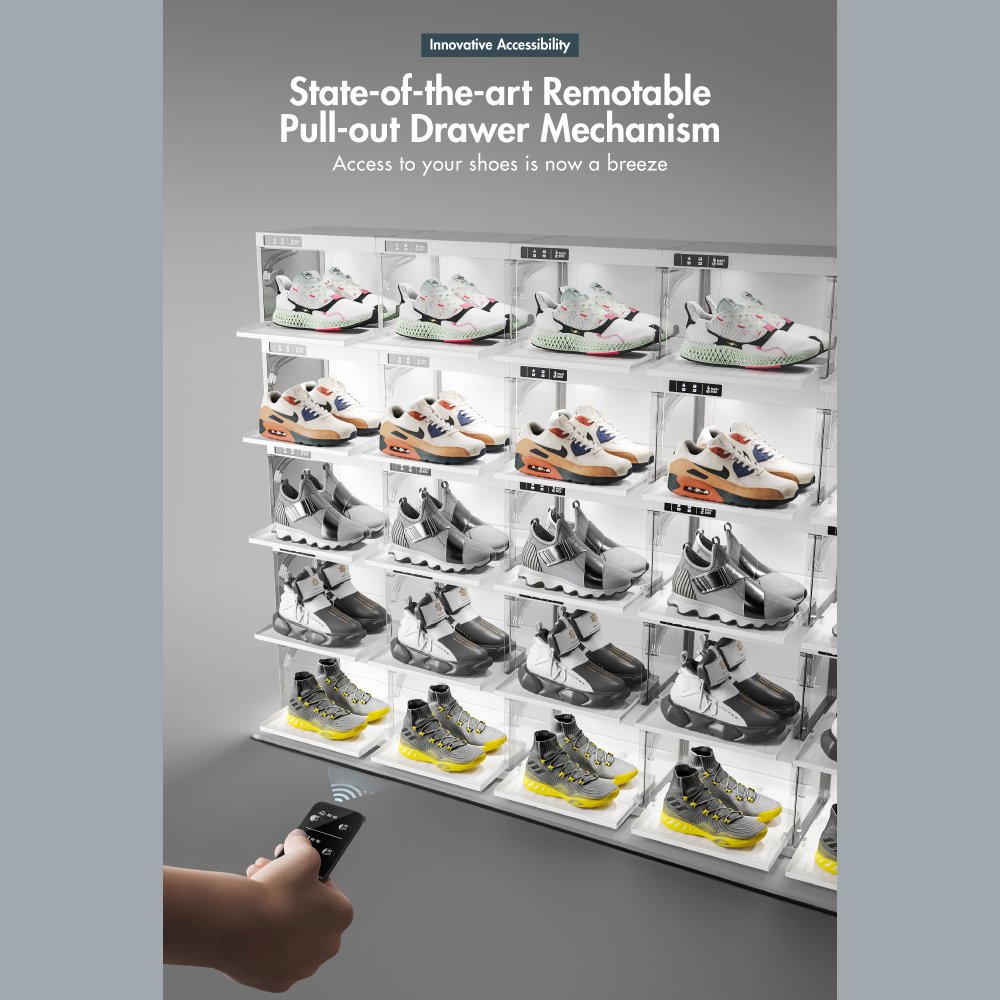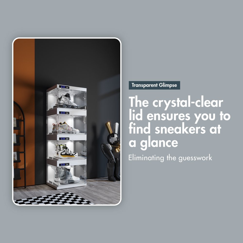 Here’s where form meets function. The SoleMate IllumiCube is brilliantly designed to stack effortlessly. Each box connects automatically with the one above. creating a secure and visually striking tower. And with its transparent lid and pull-out drawer mechanic. accessing and admiring your collection has never been this easy.