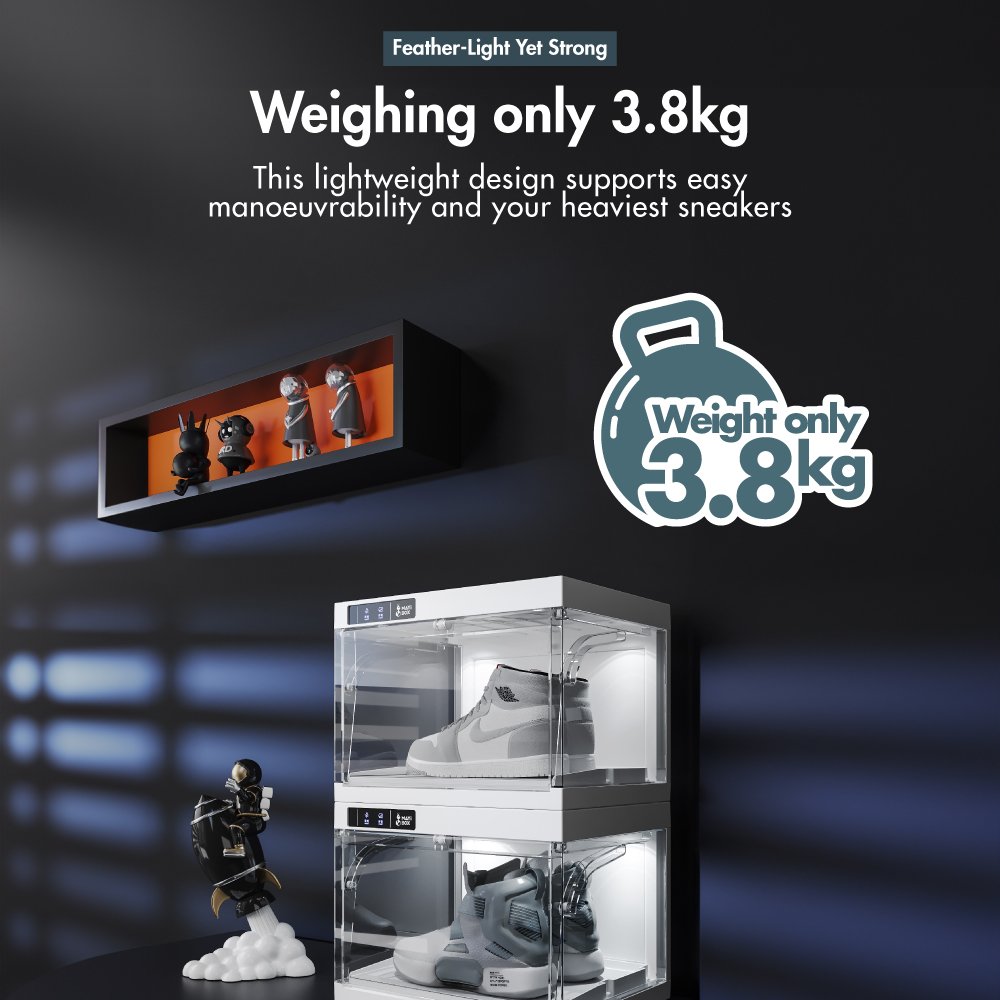 The SoleMate IllumiCube is not just any shoe display; it’s a testament to the ultimate combination of functionality and elegance. Each box is crafted with the unparalleled strength of Acrylonitrile Butadiene Styrene (ABS) and Polycarbonate (PC). ensuring durability and a sleek finish. Including LED lights takes this piece a notch higher. allowing your prized footwear to shine in all its glory.