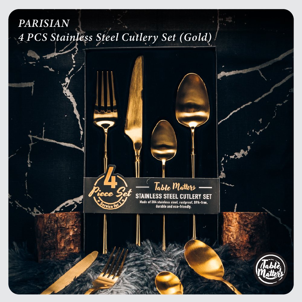 Unlock an extraordinary dining experience with Table Matters’ Parisian 4 Piece Stainless Steel Cutlery Set in stunning Gold. Directly from the divine streets of Paris to the heart of Singapore. this captivating collection will transform your meals into luxurious banquets. Tailored with precision. every inch of this 24 x 11 x 5 inches set echoes exquisite craftsmanship and quality. making your dining table a realm of elegance and sophistication.