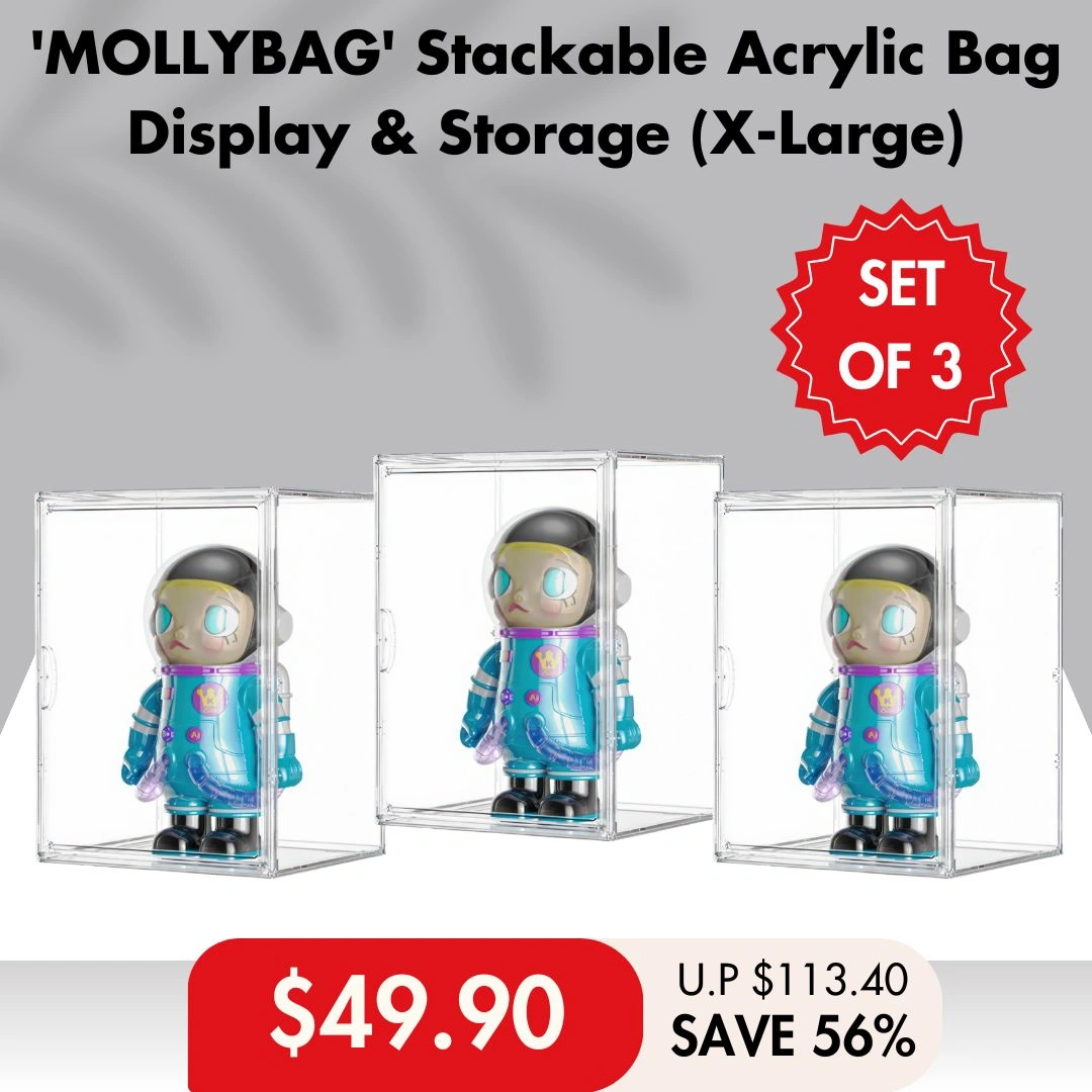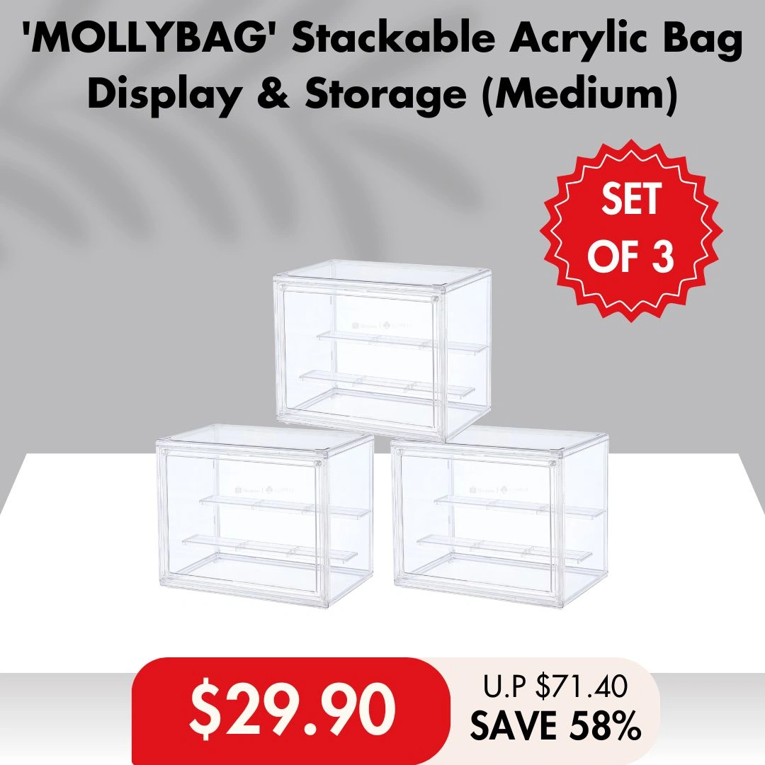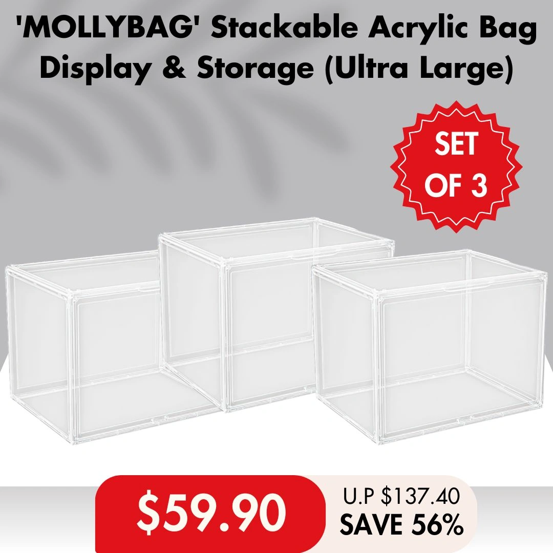 The MollyBag Stackable Acrylic Bag Storage Collection is a stylish and practical solution for organizing and displaying your handbags. purses. and other accessories. Made from clear. durable acrylic. these storage boxes provide an elegant way to showcase your collection while keeping it easily accessible and protected. Designed with a sleek. stackable feature. the MollyBag collection is ideal for maximizing space in closets. bedrooms. or dressing rooms.