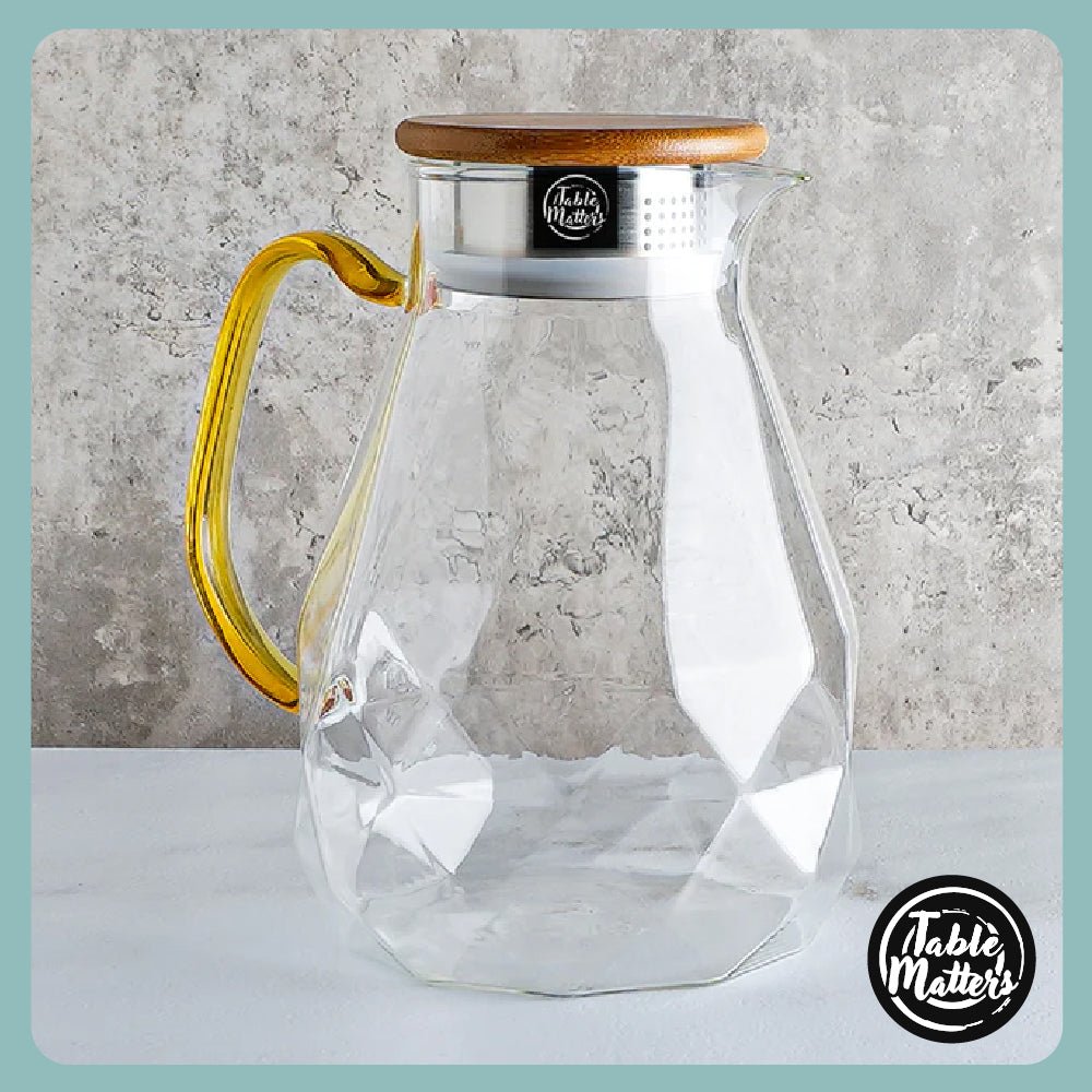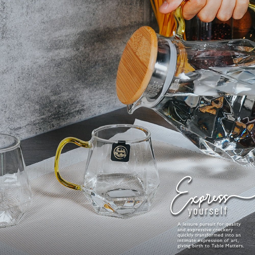 Elevate your dining experience to unparalleled sophistication with the Table Matters TAIKYU Gold Handle Diamond Jug. An embodiment of finesse and practicality. this exquisite jug is meticulously crafted from premium borosilicate glass. ensuring it graces your table with a timeless appeal. Designed to perfection with a generous 1500ml capacity and measured precision (17.3L x 8.9W x 20.1H)cm. it seamlessly blends into your dining aesthetics. amplifying them with its presence.
