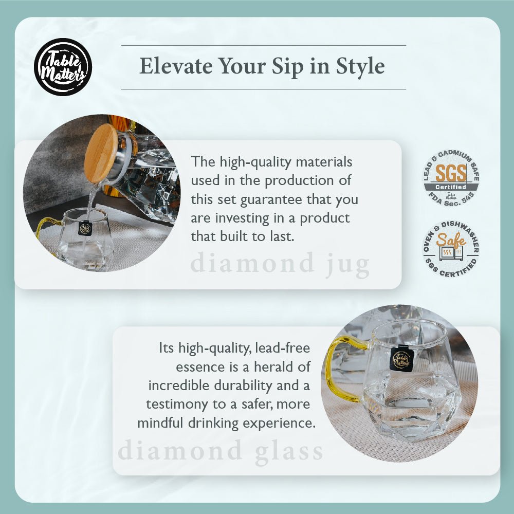What makes the TAIKYU Gold Handle Diamond Jug a crowning jewel is its extraordinary resilience against a spectrum of temperatures. Navigate through the seasons with unwavering confidence. serving a kaleidoscope of beverages. be it the warmth of hot drinks or the coolness of refreshing concoctions. Bask in the durable excellence of this masterpiece that thrives in versatility. ideally suited for an array of beverages. from the simplistic charm of infused waters to the refined elegance of exquisite wines.