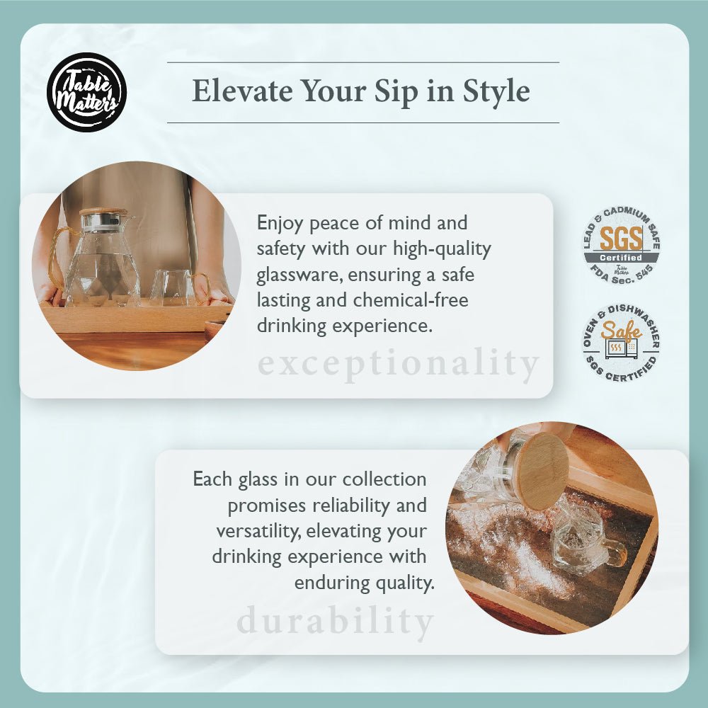 Dive into a luxurious experience with our jug that is more than just a piece of glassware – it’s a statement of luxury. Adorned with a beautiful gold handle. it effortlessly distinguishes itself from the mundane. inviting a shower of compliments. Its construction. free from Lead. guarantees a promising venture into health consciousness. making it a thoughtful consideration for the safety and well-being of your loved ones.